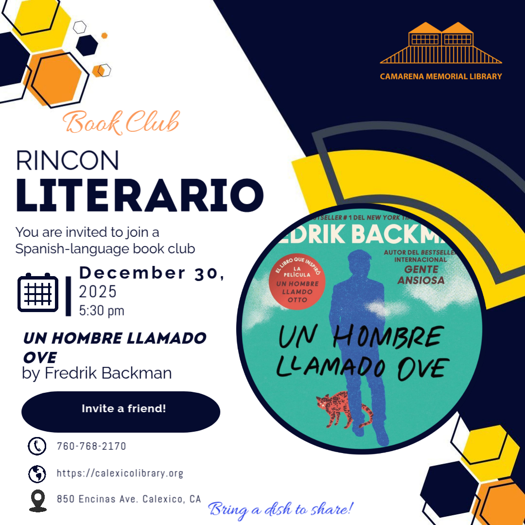 You are invited to join the new Rincon Literario Book Club. Meetings will be held on the last Wednesday of the month at 5:30 pm. It is a potluck. Bring a dish to share with the group. You may access the eBook and/or audiobook selection using Hoopla Digital. A copy of the title may be available at the library for check out.