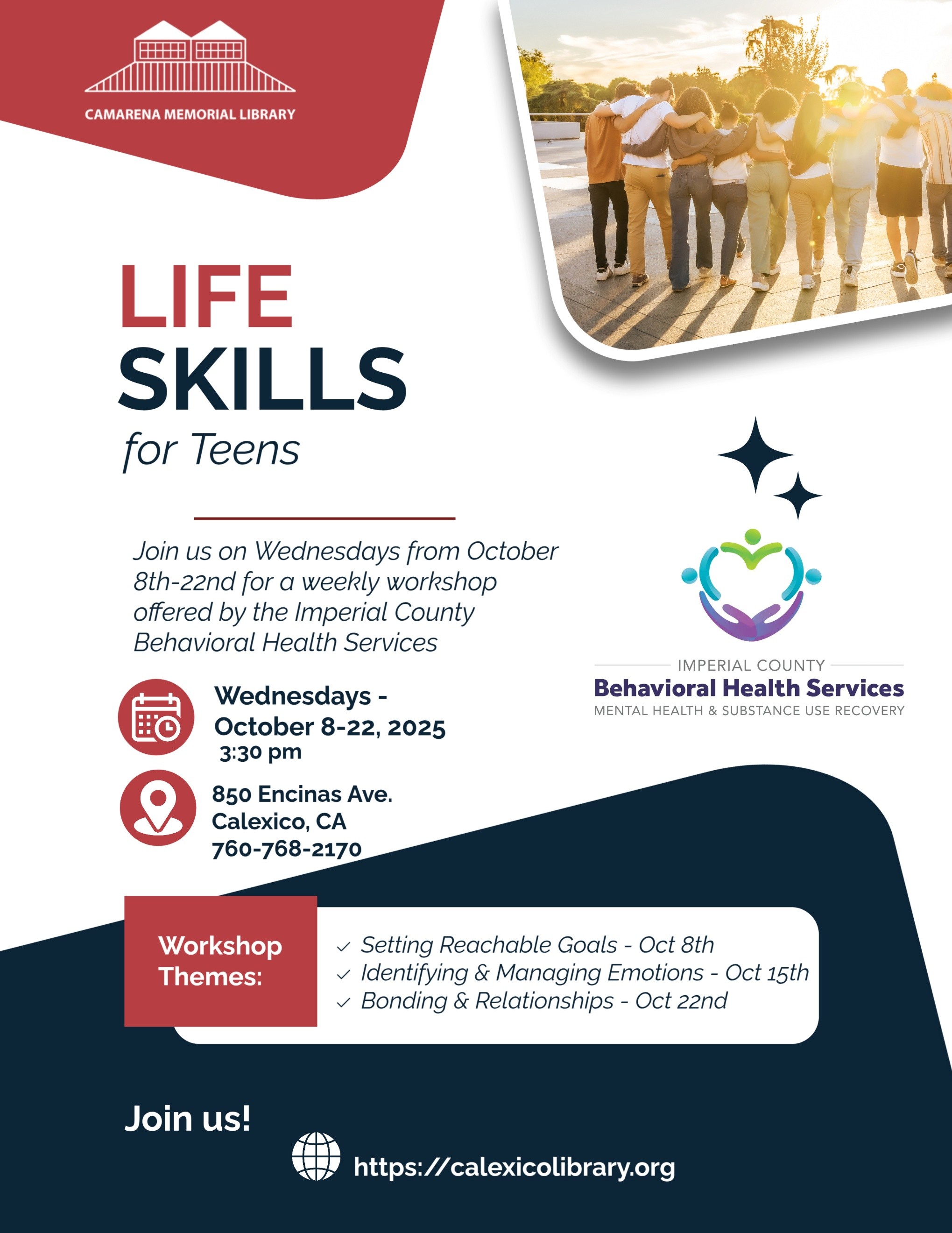 Camarena Memorial Library 850 Encinas Ave. Calexico, CA 92231 United States (760) 768-2170 Fax (760) 357-0404 Wednesday, October 22, 2025 3:30 pm to Wednesday, October 22, 2025 4:30 pm United States Audience Teens