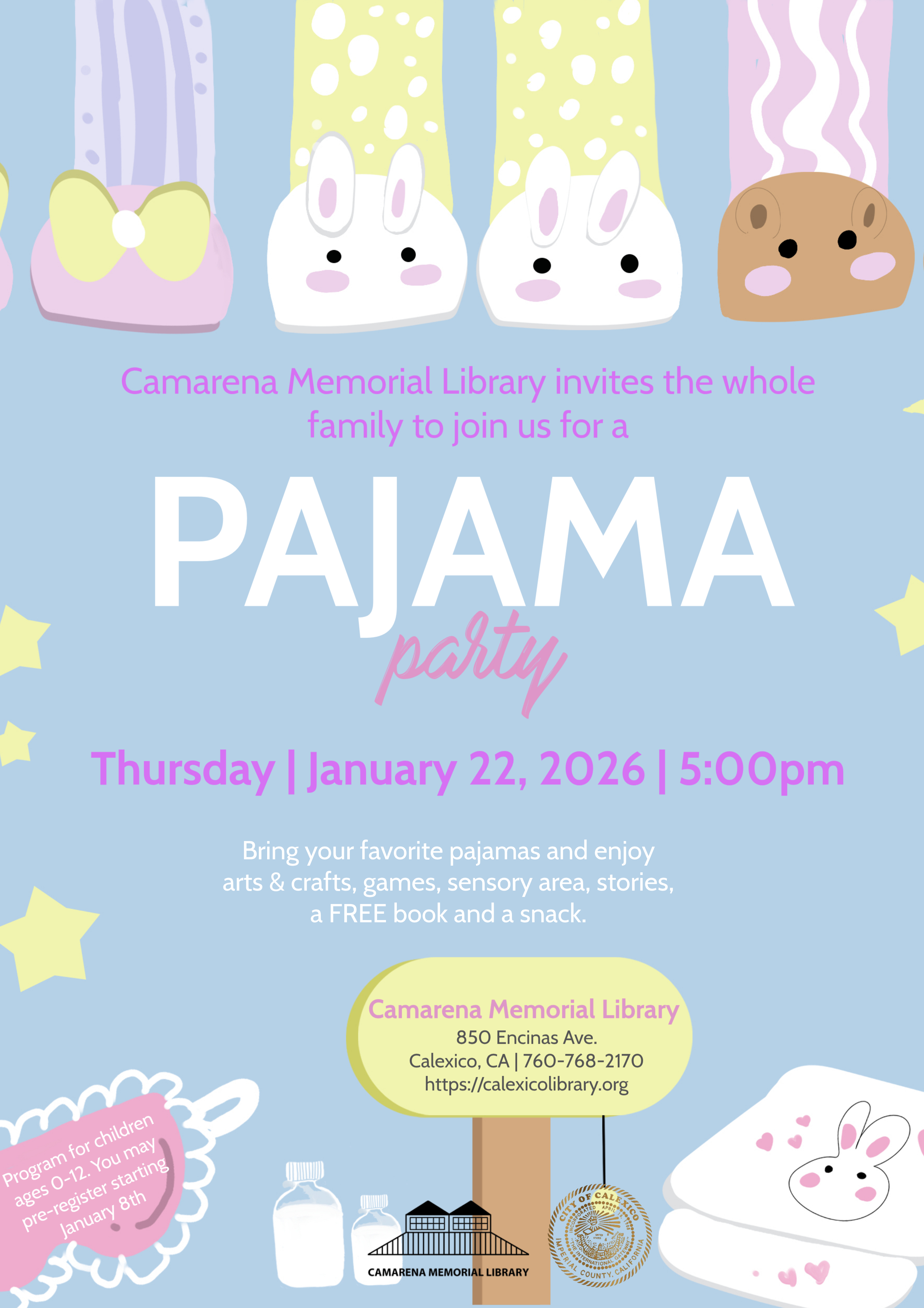 Camarena Memorial Library 850 Encinas Ave. Calexico, CA 92231 United States (760) 768-2170 Fax (760) 357-0404 Thursday, January 22, 2026 5:00 pm to Thursday, January 22, 2026 7:00 pm United States Audience Adults Kids