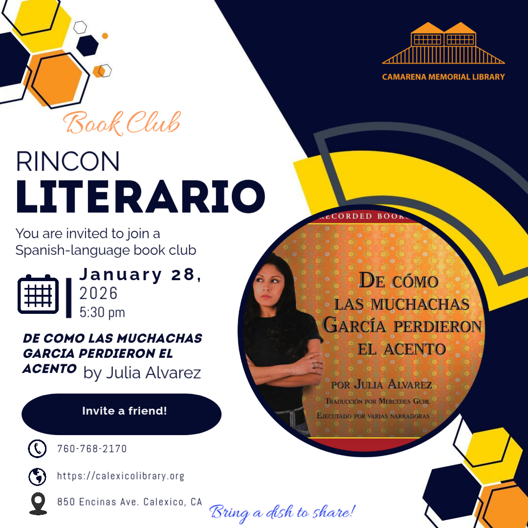 Camarena Memorial Library 850 Encinas Ave. Calexico, CA 92231 United States (760) 768-2170 Fax (760) 357-0404 Wednesday, January 28, 2026 5:30 pm to Wednesday, January 28, 2026 6:30 pm United States Audience Adults