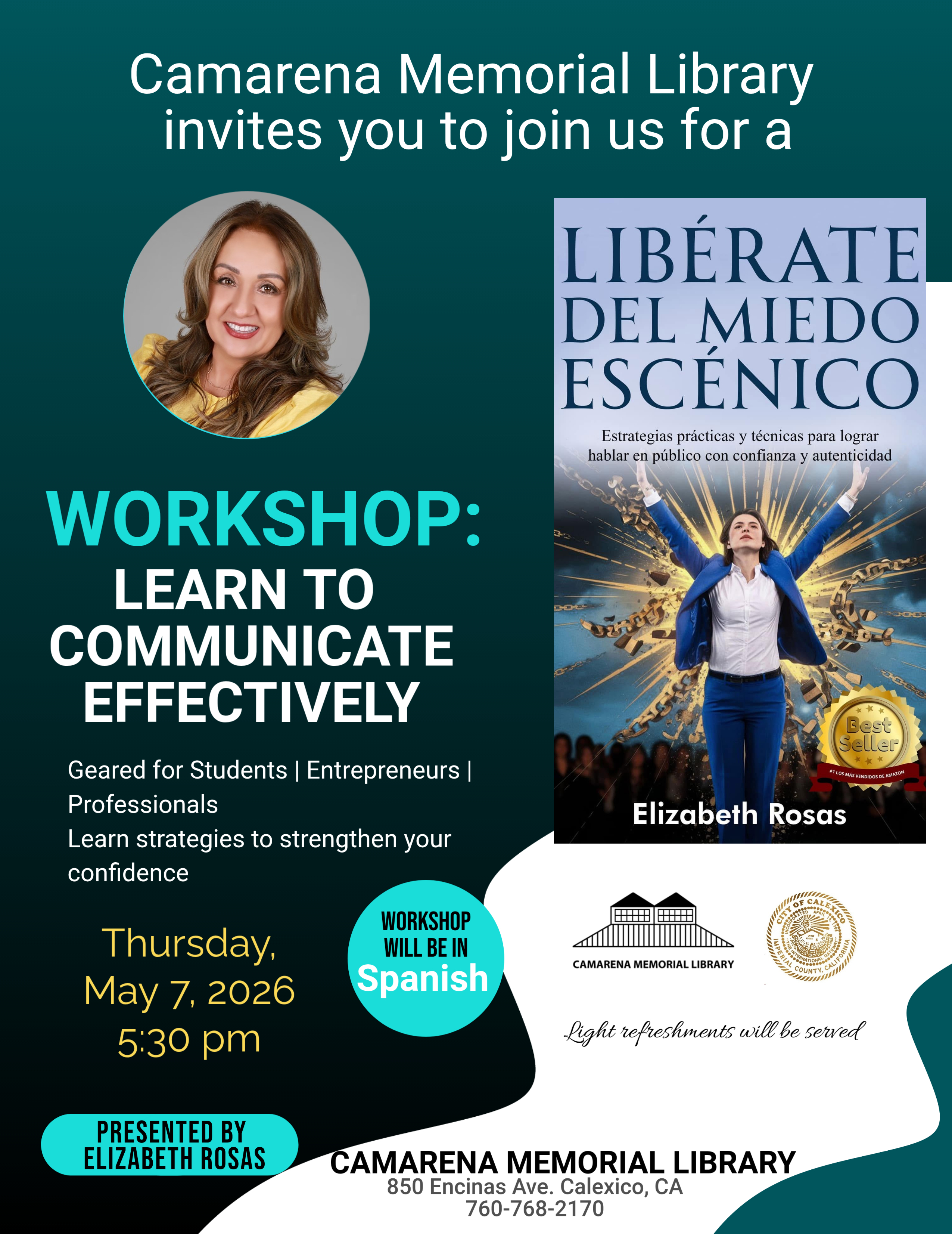 Join us and Author Elizabeth Rosas and learn how to communicate effectively. This workshop is geared towards students, entrepreneurs and professionals. Light refreshments will be served.