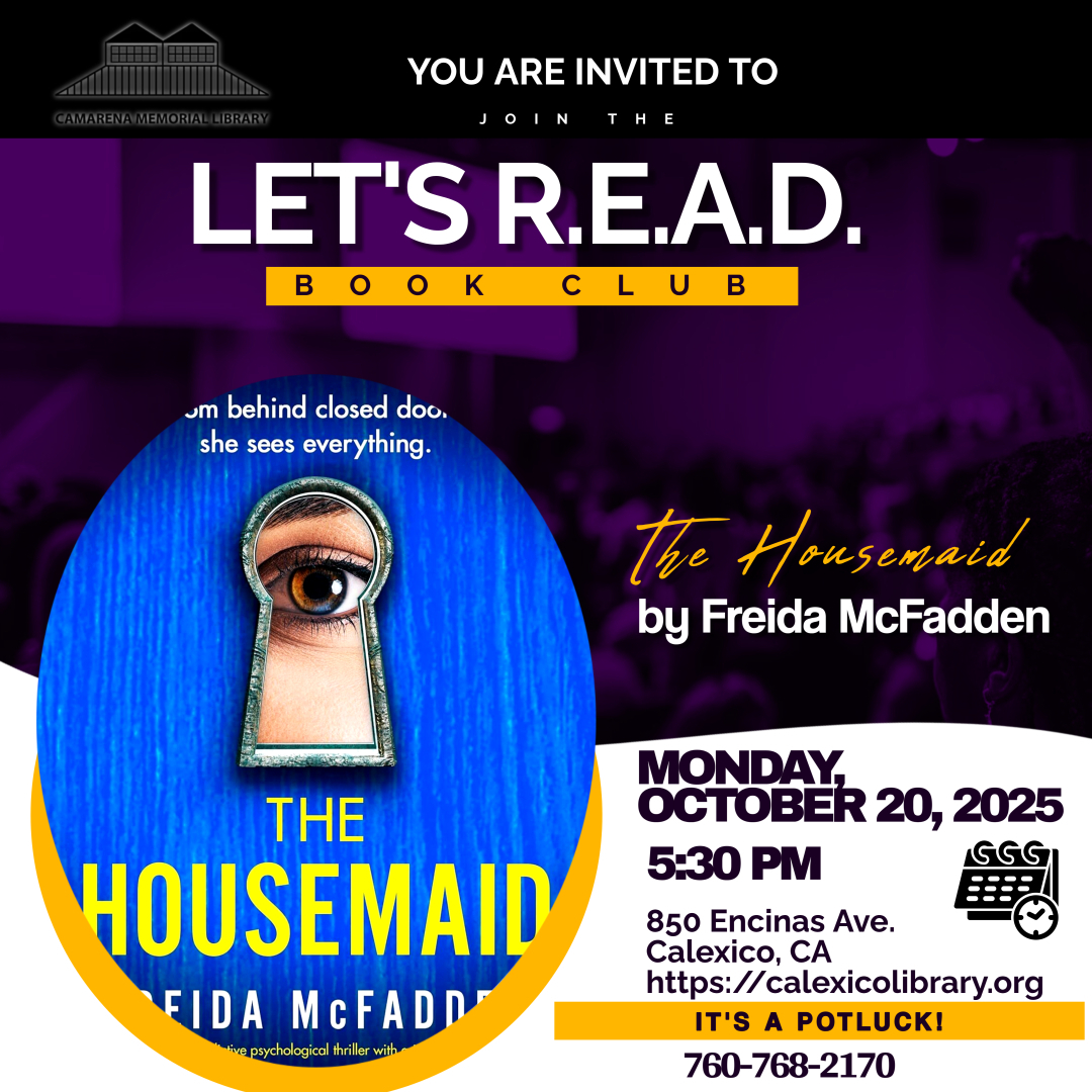 You are invited to join the Let's R.E.A.D. (Read, Eat, & Discuss) Book Club. Meetings are held once a month on Mondays (please check the monthly calendar for the specific date) at 5:30 pm. It is a potluck! Bring a dish to share with the group.
