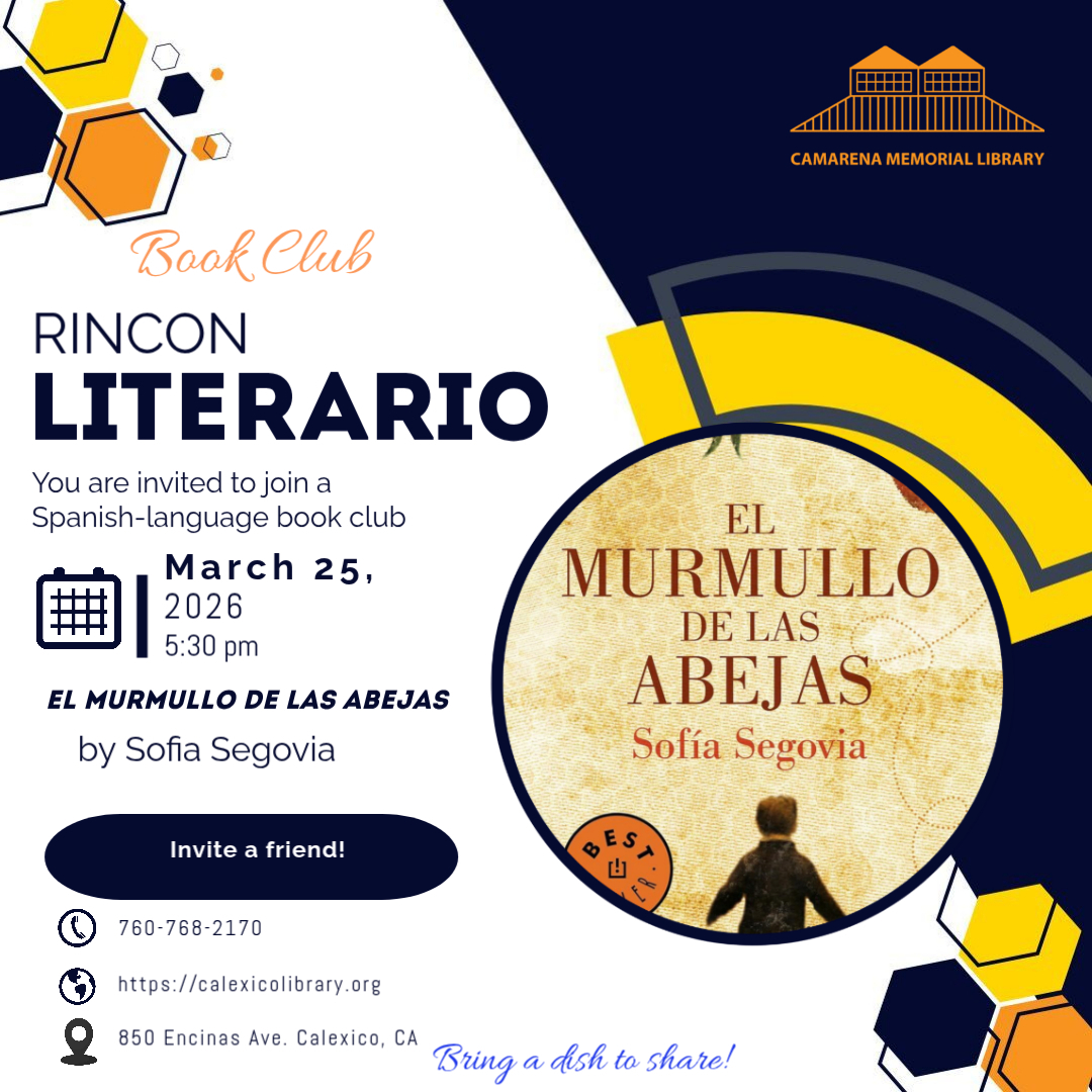 You are invited to join the new Rincon Literario Book Club. Meetings will be held on the last Wednesday of the month at 5:30 pm. It is a potluck. Bring a dish to share with the group. You may access the eBook and/or audiobook selection using Hoopla Digital. A copy of the title may be available at the library for check out.