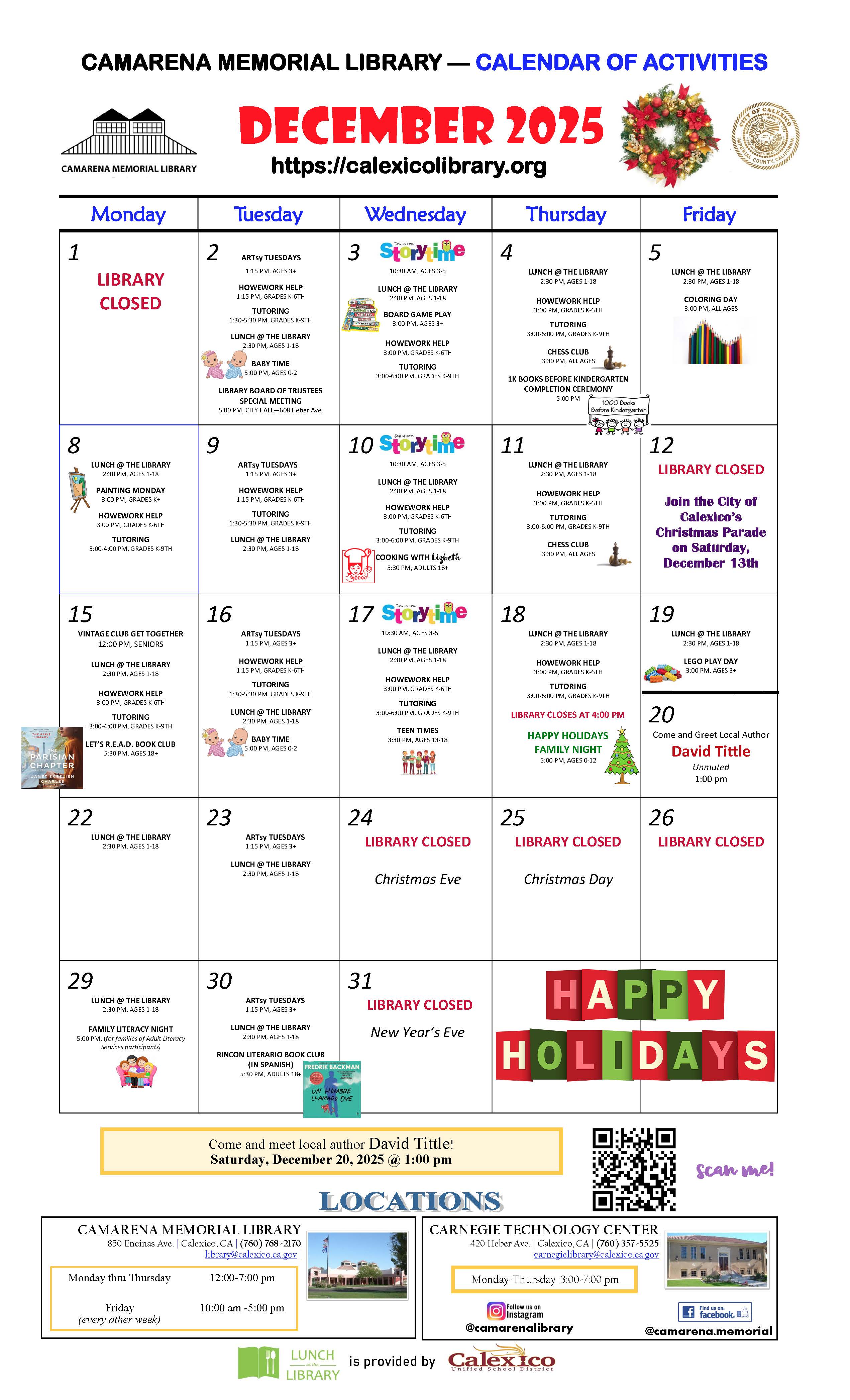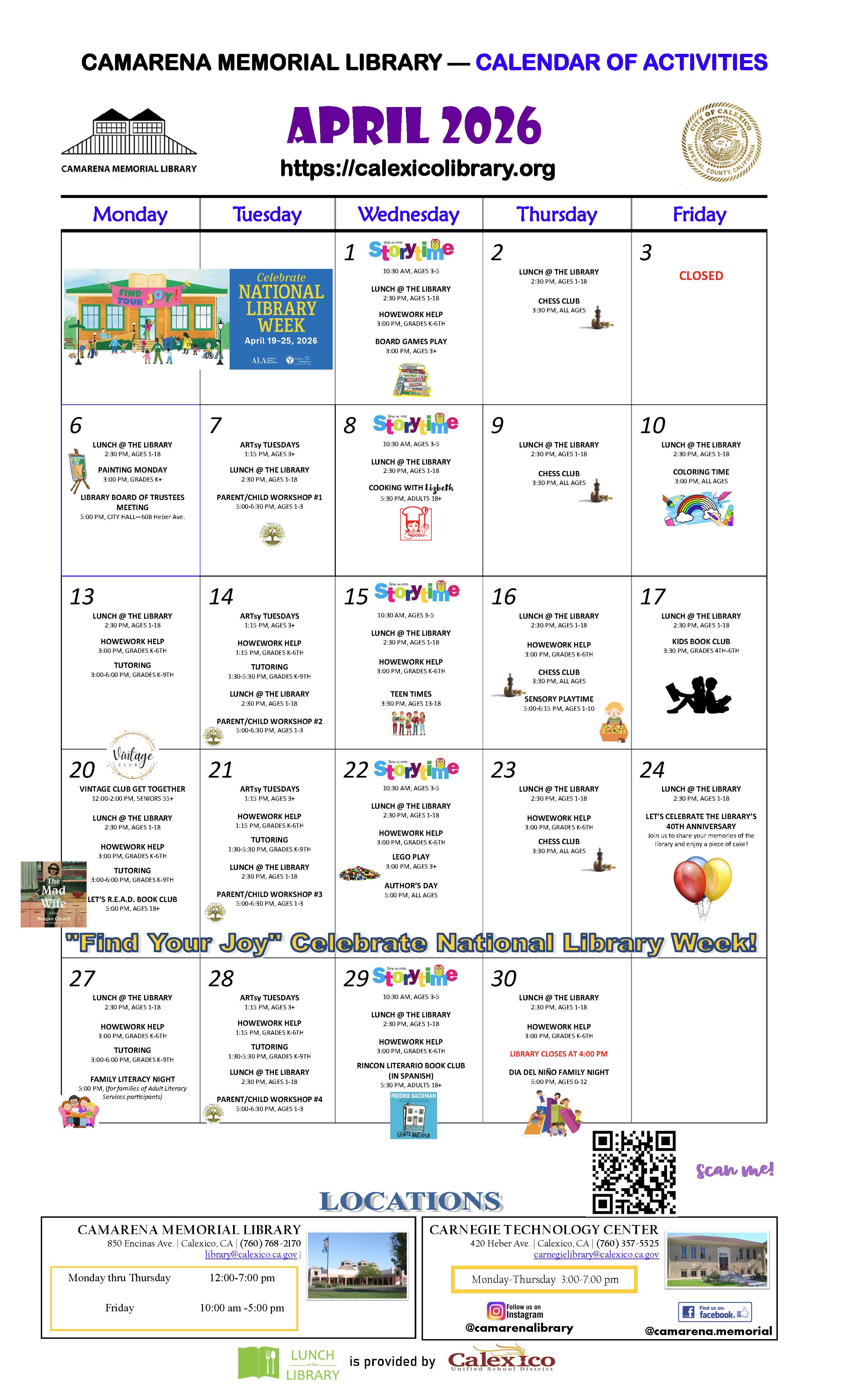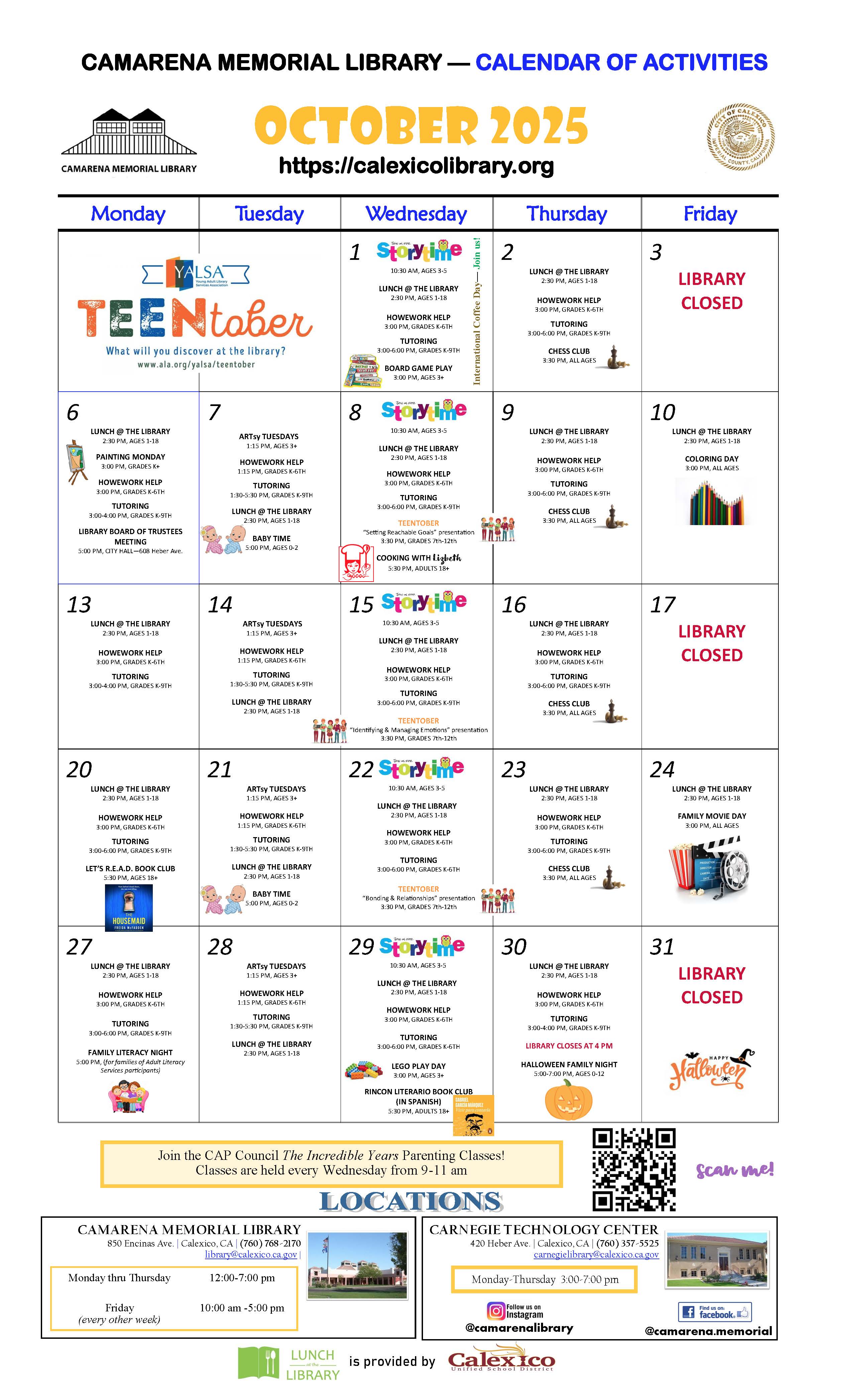 Here you will find information about classes, programs and services offered at the Camarena Memorial Library located at 850 Encinas Ave. in Calexico, CA