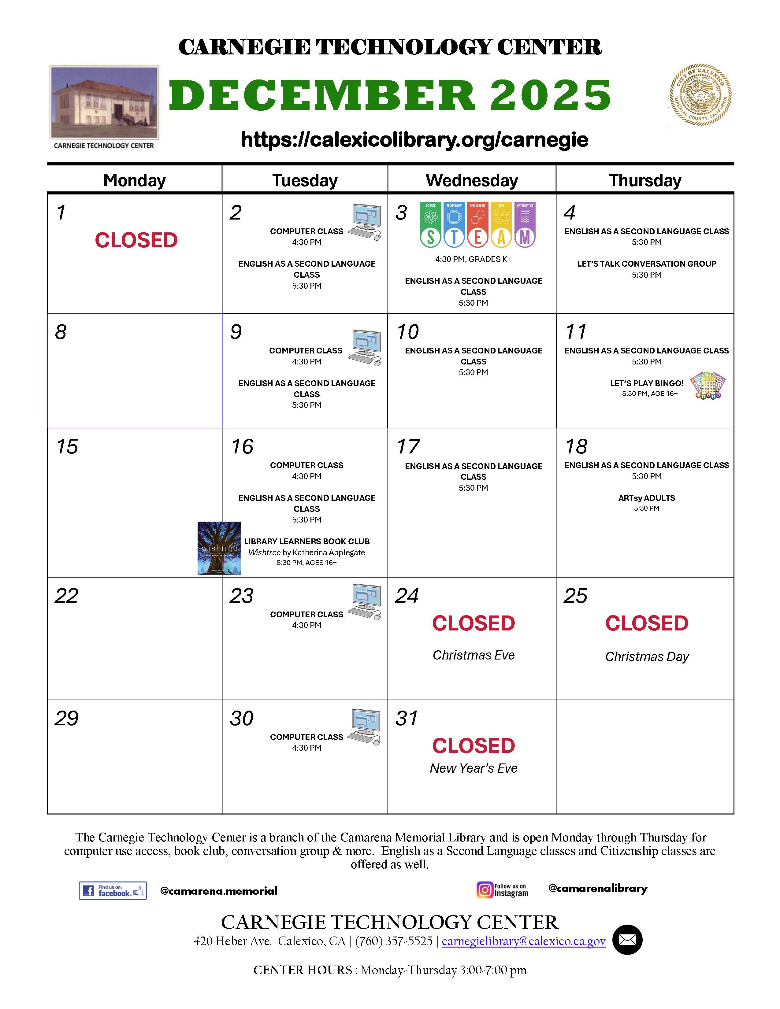 Here you will find information about classes, programs and services offered at the Carnegie Technology Center located at 420 Heber Ave. in Calexico, CA