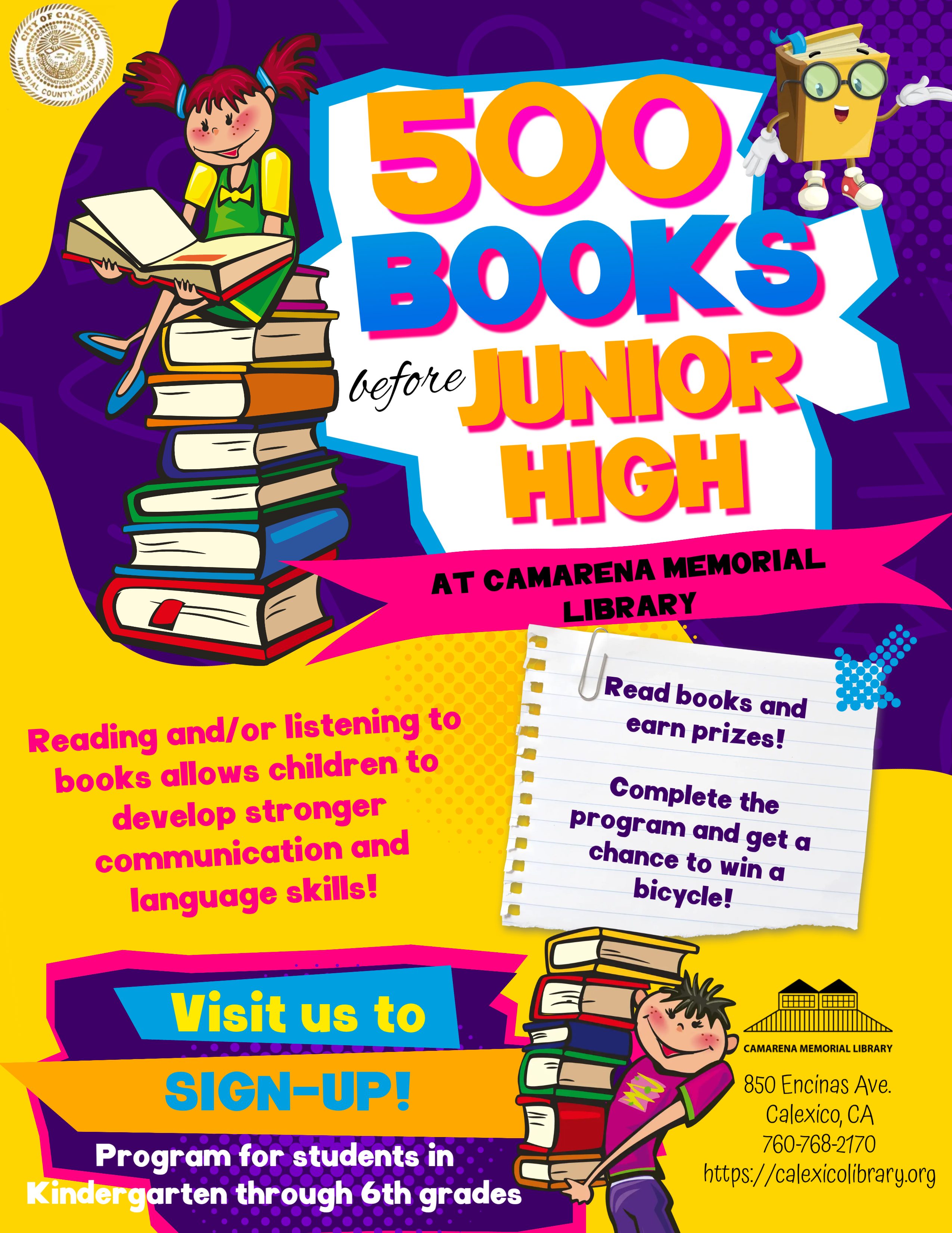 Camarena Memorial Library invites children in Kinder through 6th grade to sign-up for the 500 Books before Junior High program.