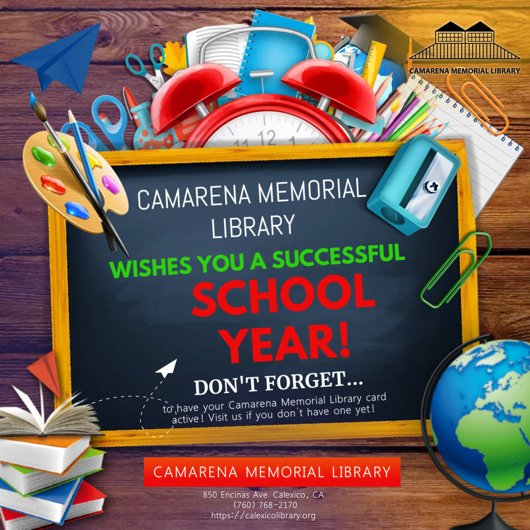 Camarena Memorial Library 850 Encinas Ave. Calexico, CA 92231 United States (760) 768-2170 Fax (760) 357-0404 Monday, August 22, 2022 12:00 am to Monday, August 22, 2022 11:59 pm United States /librarycard Audience Adults Kids Teens