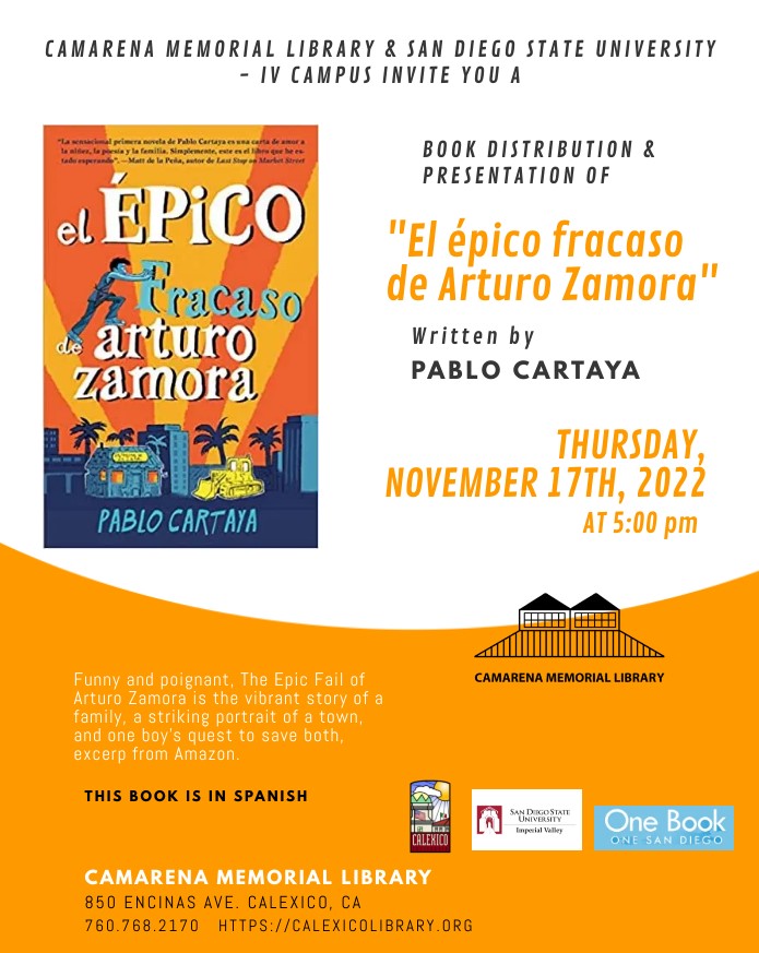 Camarena Memorial Library 850 Encinas Ave. Calexico, CA 92231 United States (760) 768-2170 Fax (760) 357-0404 Thursday, November 17, 2022 5:00 pm to Thursday, November 17, 2022 6:00 pm United States Audience Adults Teens