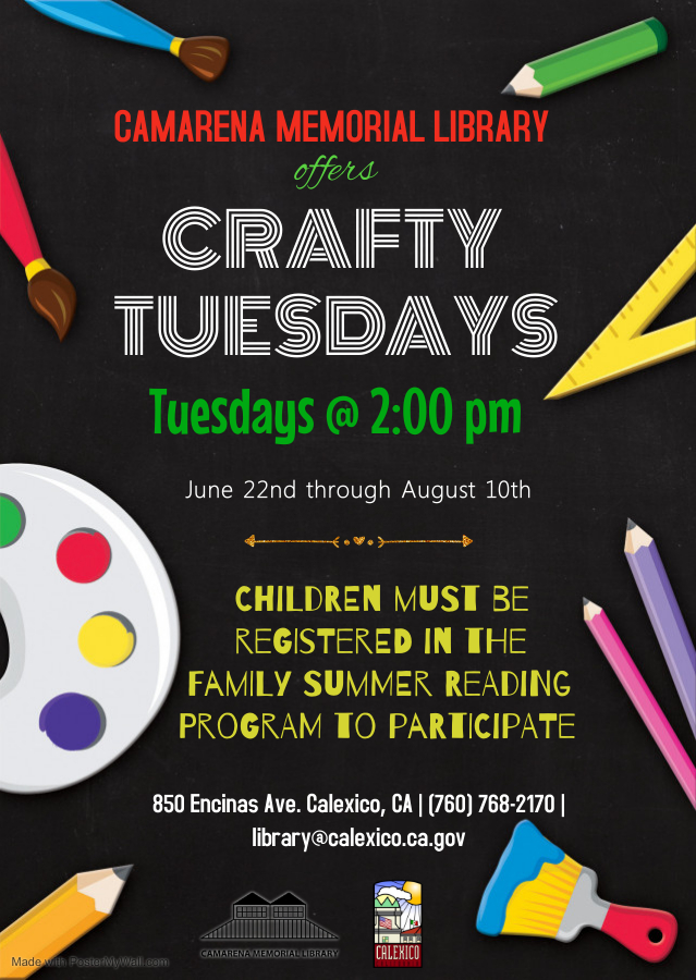 Camarena Memorial Library 850 Encinas Ave. Calexico, CA 92231 United States (760) 768-2170 Fax (760) 357-0404 Tuesday, June 22, 2021 2:00 pm to Tuesday, June 22, 2021 3:00 pm United States Audience Kids
