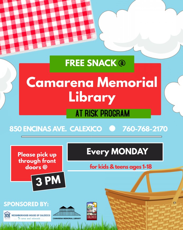 Camarena Memorial Library 850 Encinas Ave. Calexico, CA 92231 United States (760) 768-2170 Fax (760) 357-0404 Monday, June 6, 2022 4:00 pm to Sunday, June 5, 2022 5:00 pm United States Children ages 1-18 may pick up a weekly snack to-go on Mondays at 3:00 pm. Audience Kids Teens