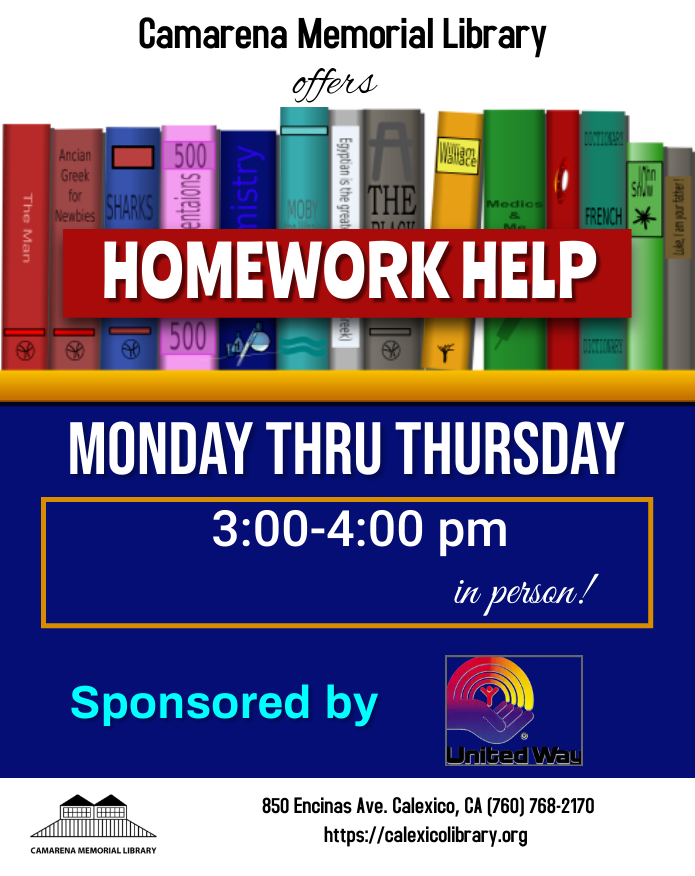 Camarena Memorial Library 850 Encinas Ave. Calexico, CA 92231 United States (760) 768-2170 Fax (760) 357-0404 Monday, March 21, 2022 3:00 pm to Thursday, March 24, 2022 4:00 pm United States Audience Kids