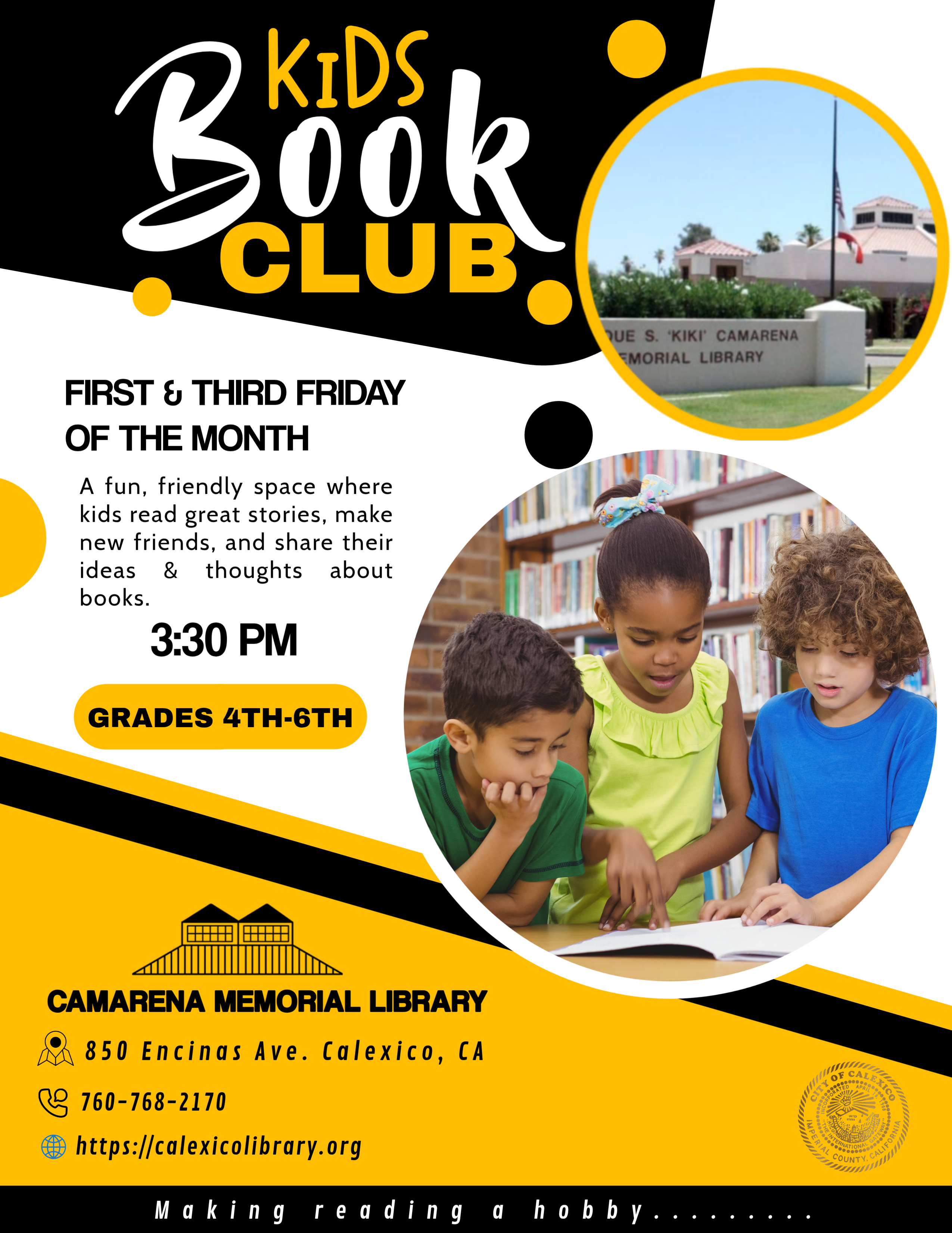 Camarena Memorial Library 850 Encinas Ave. Calexico, CA 92231 United States (760) 768-2170 Fax (760) 357-0404 Friday, January 2, 2026 3:30 pm to Friday, January 2, 2026 4:30 pm United States Audience Kids