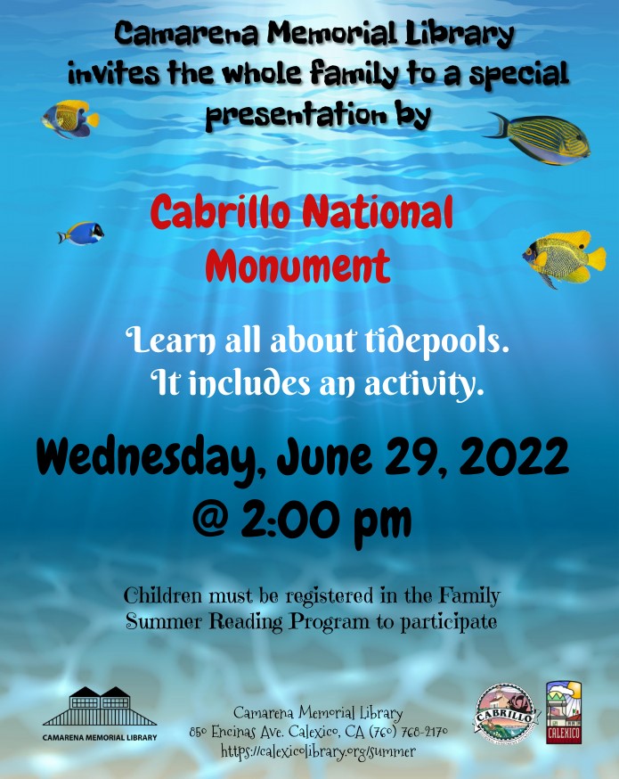 Camarena Memorial Library 850 Encinas Ave. Calexico, CA 92231 United States (760) 768-2170 Fax (760) 357-0404 Wednesday, June 29, 2022 2:00 pm to Wednesday, June 29, 2022 3:00 pm United States Audience Adults Kids Teens