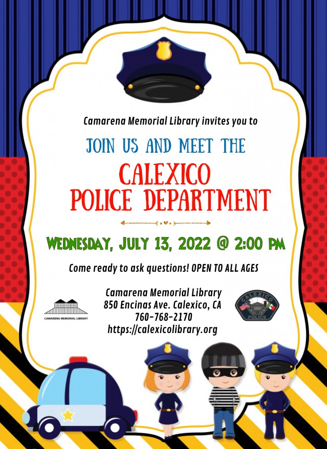 Camarena Memorial Library 850 Encinas Ave. Calexico, CA 92231 United States (760) 768-2170 Fax (760) 357-0404 Wednesday, July 13, 2022 2:00 pm to Wednesday, July 13, 2022 3:00 pm United States Audience Adults Kids Teens
