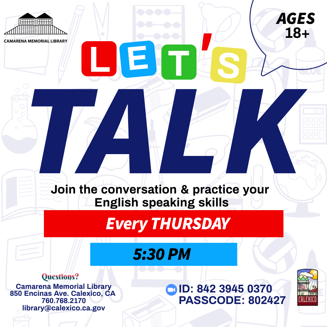 Thursday, April 21, 2022 5:30 pm to Thursday, April 21, 2022 6:30 pm United States Join us on Thursdays and practice your English speaking skills at 5:30 pm via Zoom. Zoom ID: 842 3945 0370 Passcode: 802427 Audience Adults