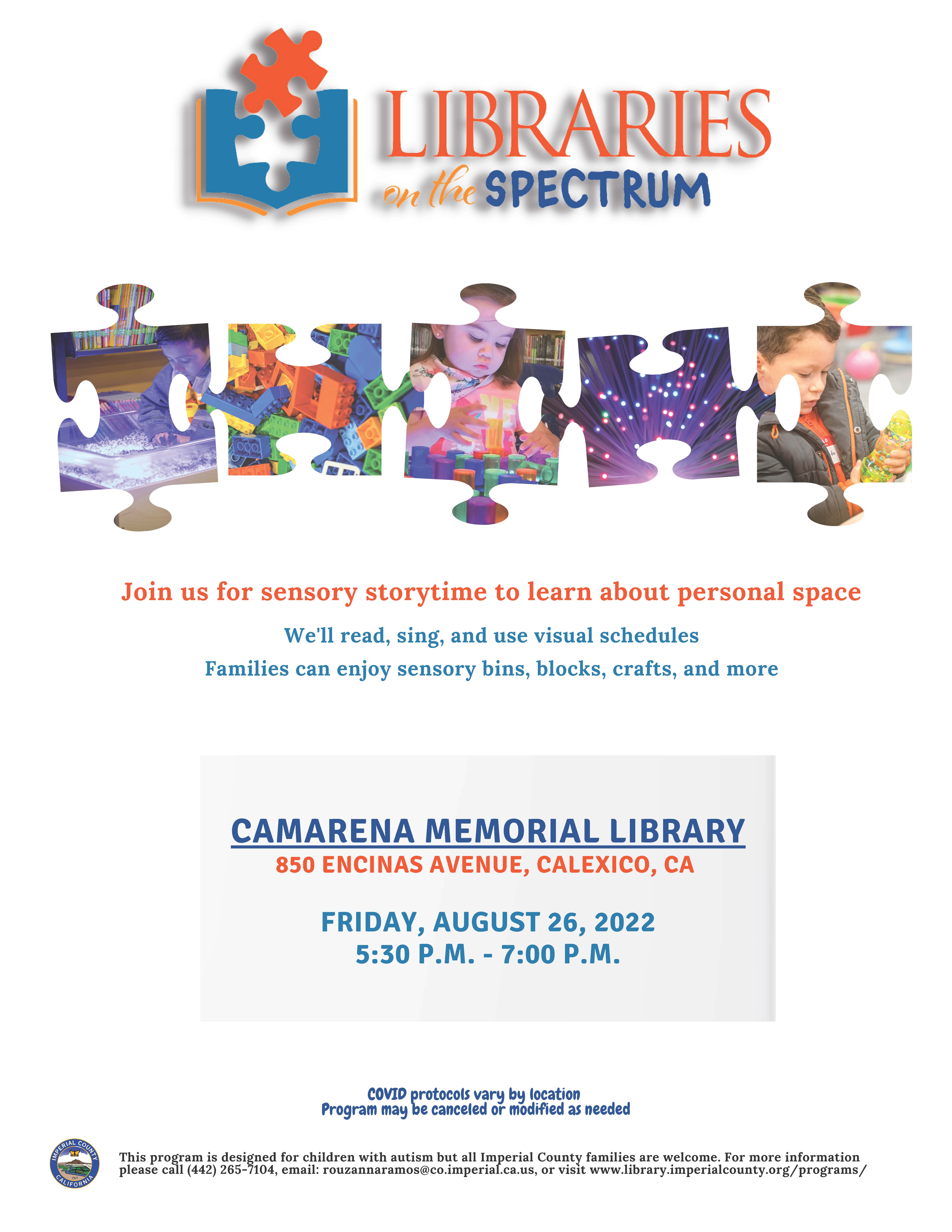 Camarena Memorial Library 850 Encinas Ave. Calexico, CA 92231 United States (760) 768-2170 Fax (760) 357-0404 Friday, August 26, 2022 5:30 pm to Friday, August 26, 2022 7:00 pm United States Audience Adults Kids