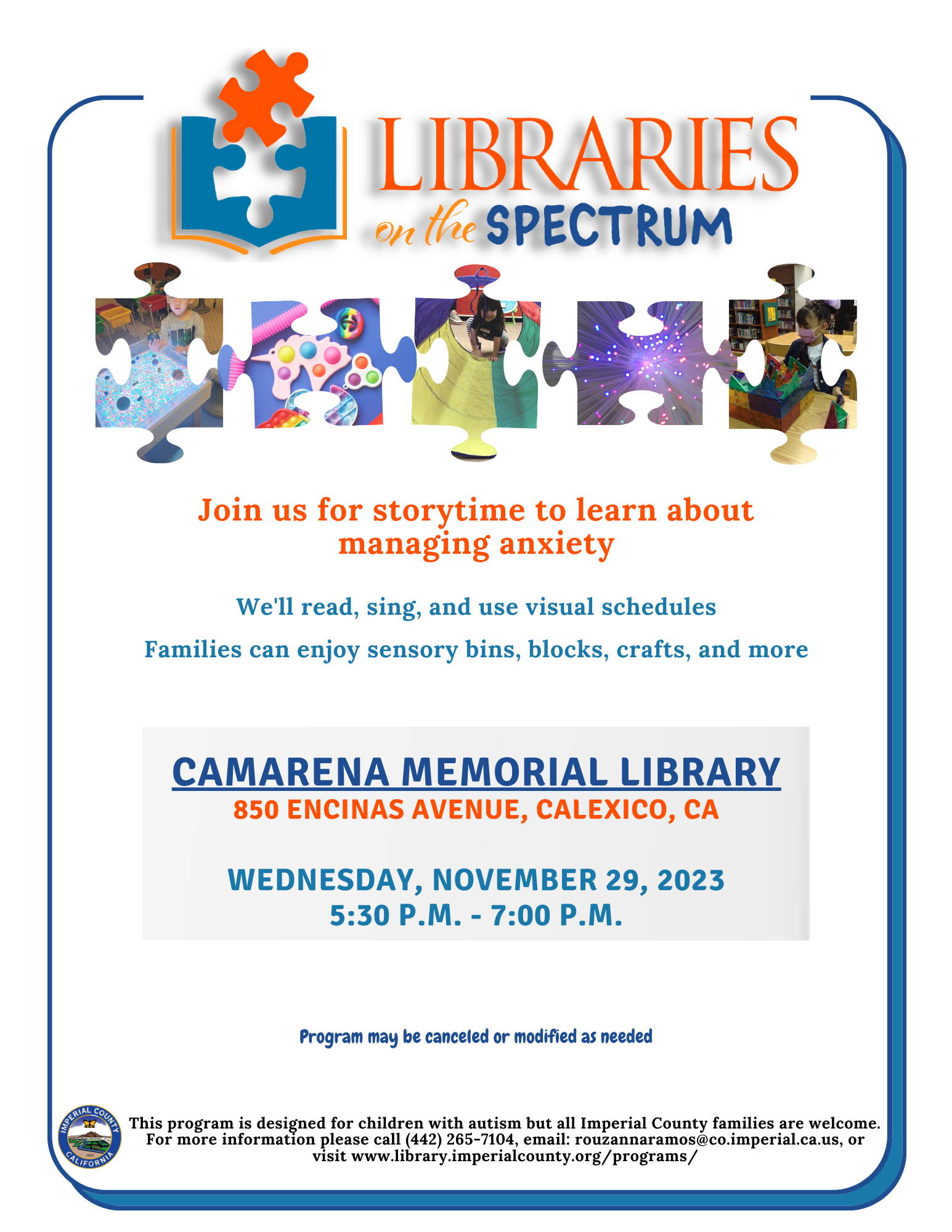 Camarena Memorial Library 850 Encinas Ave. Calexico, CA 92231 United States (760) 768-2170 Fax (760) 357-0404 Wednesday, November 29, 2023 5:30 pm to Wednesday, November 29, 2023 7:00 pm United States Everyone is welcome! Audience Adults Kids
