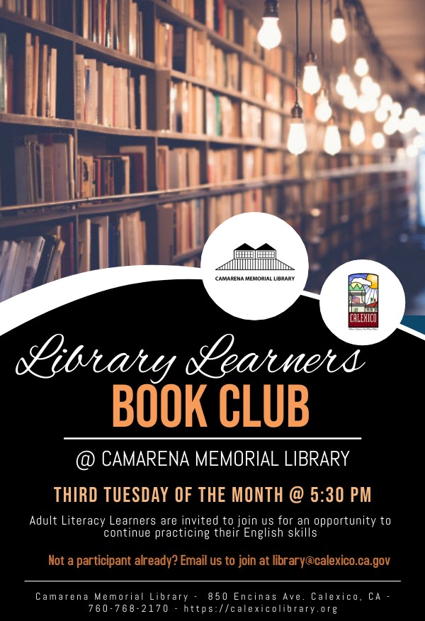 Camarena Memorial Library 850 Encinas Ave. Calexico, CA 92231 United States (760) 768-2170 Fax (760) 357-0404 Tuesday, December 20, 2022 5:30 pm to Tuesday, December 20, 2022 6:30 pm United States Audience Adults