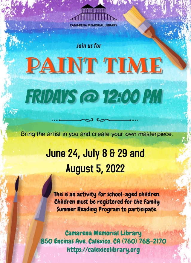 Camarena Memorial Library 850 Encinas Ave. Calexico, CA 92231 United States (760) 768-2170 Fax (760) 357-0404 Friday, August 5, 2022 12:00 pm to Friday, August 5, 2022 1:00 pm United States Bring the artist in you and create your own masterpiece. Every other Friday at 12:00 pm. Audience Kids