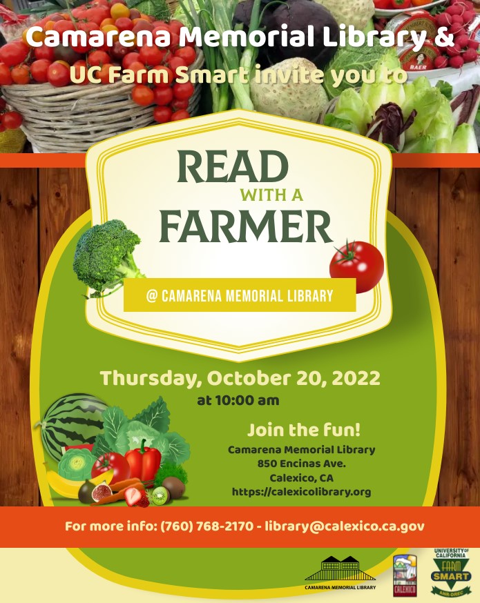 Camarena Memorial Library 850 Encinas Ave. Calexico, CA 92231 United States (760) 768-2170 Fax (760) 357-0404 Thursday, October 20, 2022 10:00 am to Thursday, October 20, 2022 11:00 am United States Audience Adults Kids