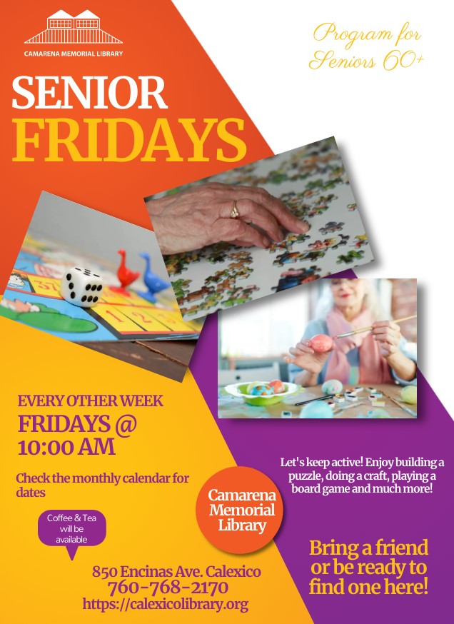 Camarena Memorial Library 850 Encinas Ave. Calexico, CA 92231 United States (760) 768-2170 Fax (760) 357-0404 Friday, August 18, 2023 10:00 pm to Friday, August 18, 2023 11:00 pm United States Audience Adults