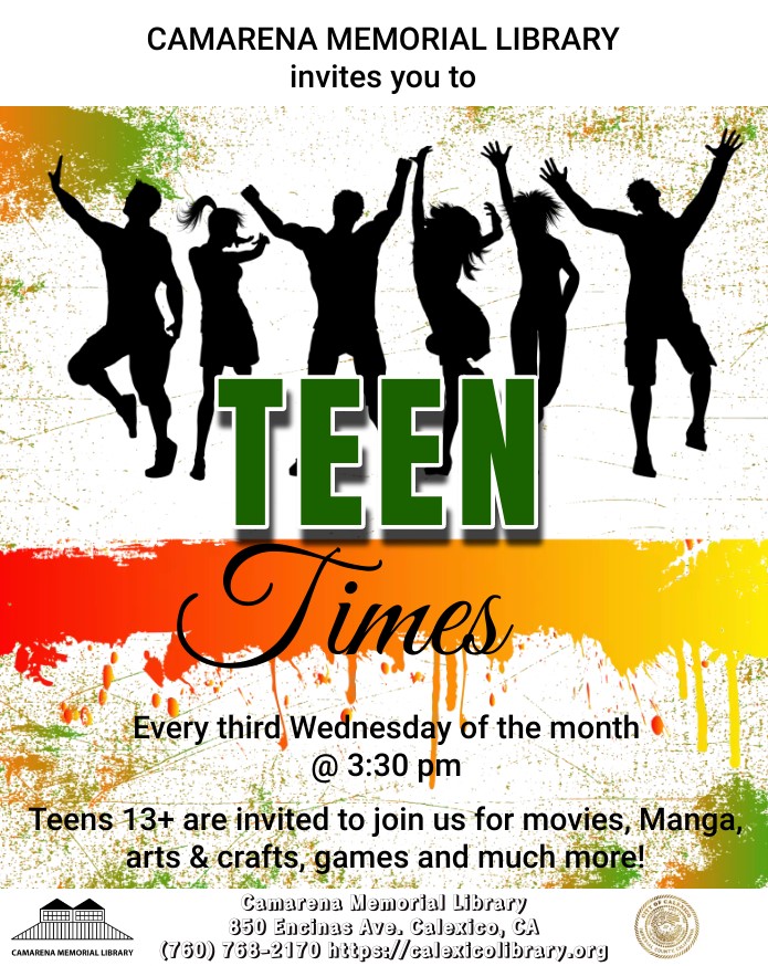 Camarena Memorial Library 850 Encinas Ave. Calexico, CA 92231 United States (760) 768-2170 Fax (760) 357-0404 Wednesday, November 15, 2023 3:30 pm to Wednesday, November 15, 2023 4:30 pm United States Audience Teens