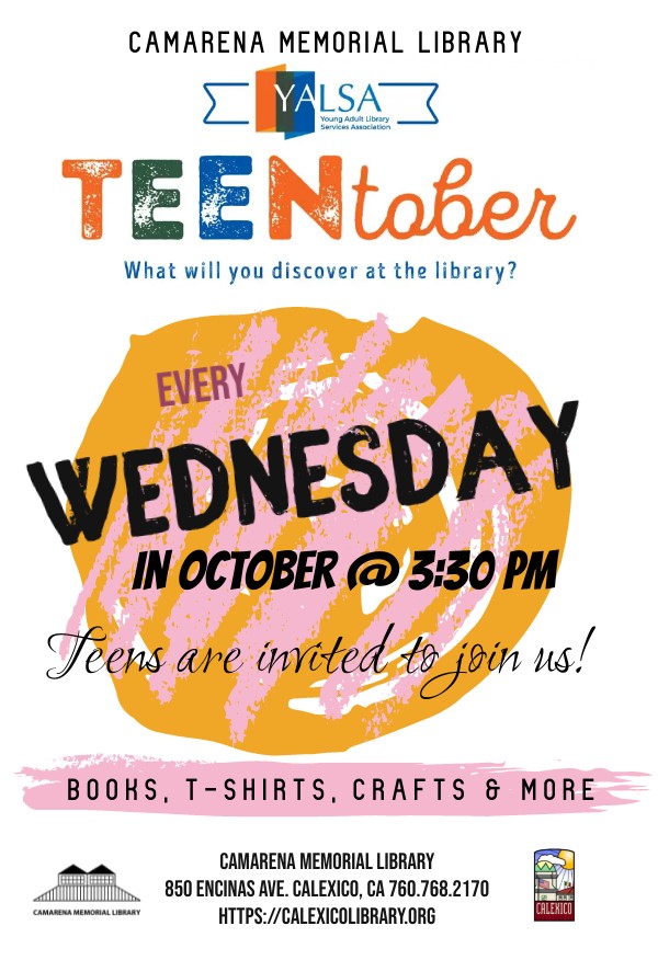 Camarena Memorial Library 850 Encinas Ave. Calexico, CA 92231 United States (760) 768-2170 Fax (760) 357-0404 Wednesday, October 26, 2022 3:30 pm to Wednesday, October 26, 2022 4:30 pm United States Audience Teens