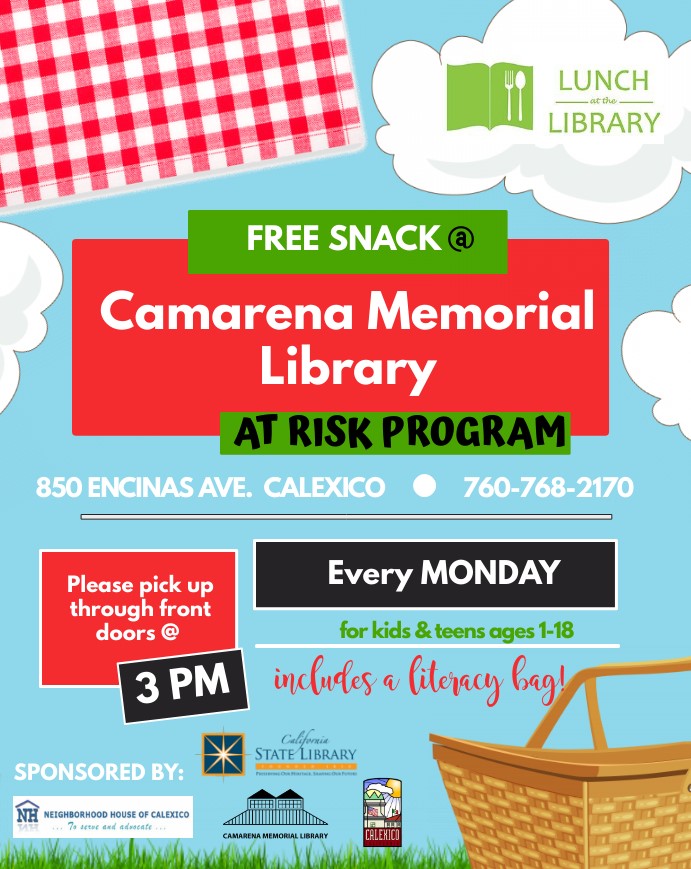 Free snack Children ages 1-18 may pick up a weekly snack to-go on Mondays at 3:00 pm. Read more about Free snack